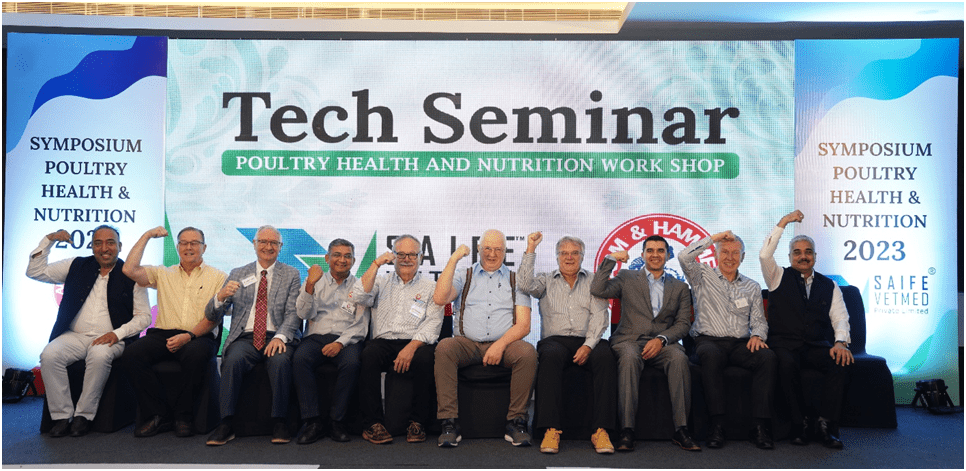 Saife Vetmed, Indien, und Arm & Hammer, USA, setzte seine geschätzte Tradition der Förderung einer dynamischen Plattform für Branchenexperten, Akademiker und Tierärzte fort und veranstaltete im August 2023 das zweite jährliche technische Symposium. Die Veranstaltung fand vom 9. bis 10. August 2023 in Hilton, Bangalore, statt. gefolgt von einem großen Höhepunkt im Radisson Blu, Delhi am 11. und 12. August. Dieses Symposium brachte nicht nur wichtige Akteure aus der Geflügelindustrie zusammen, darunter prominente Namen wie Venkys, Suguna, IB Group, Baramatiagro, Premium Chicks, CPF, Godrej, Sreenivasan Farms, Skylark, Noveltech, Nanda Feeds, Shalimar Pellet Feeds, Phoenix und Sakku Gruppen, MPWPCL, Poultry Federation (PFI) von Indien, zog aber auch Teilnehmer aus 15 Ländern an, darunter Vietnam, Malaysia, Thailand, Algerien, Tunesien, Marokko, Türkei, Vereinigte Arabische Emirate, Nepal und Bangladesch. Lanxess, Deutschland und Anpario, Großbritannien Mitarbeiter von Saife Vetmed, Indien, markierten ihre Präsenz durch ihr internationales Team.![]()